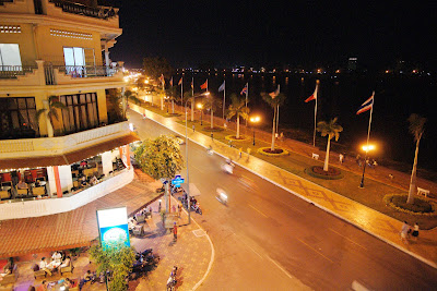 After the boat ride we decided to stop for a drink at the famous FCC (Foreign Correspondence Club) recommended by lonely planet and other tour guide books. It was on the river front - where else? We went to the roof top of FCC even though it was bit muggy. Took a snap of the street down below and of the river front. There we met a monk - who happen to be sitting next to us and chugging some Angkor draft. He initiated the conversation by asking us where we were from. He was very friendly and ended up talking for almost an hour. We learned that he was from Cambodia and now lives in Chiang Mai , Thailand studying Philosophy. Has a Japanese girl friend and is going to see her in month. I was like – let me get this – He is a monk yet he drinks, travels to tourist destinations and has a girlfriend. If he just took up smoking and gambling he would be in par with all us sinful souls. He even gave us his facebook account info – haven’t had a chance to check it out yet but wherever you are "dear monk dude" – the world needs less fanatic religious gurus like you - we would have less wars and conflicts.